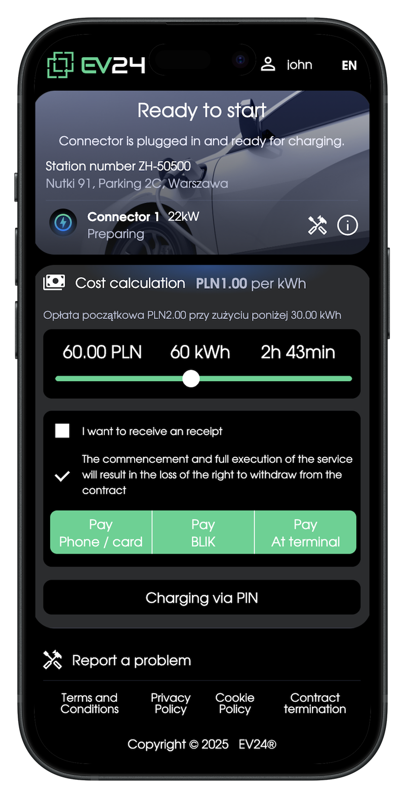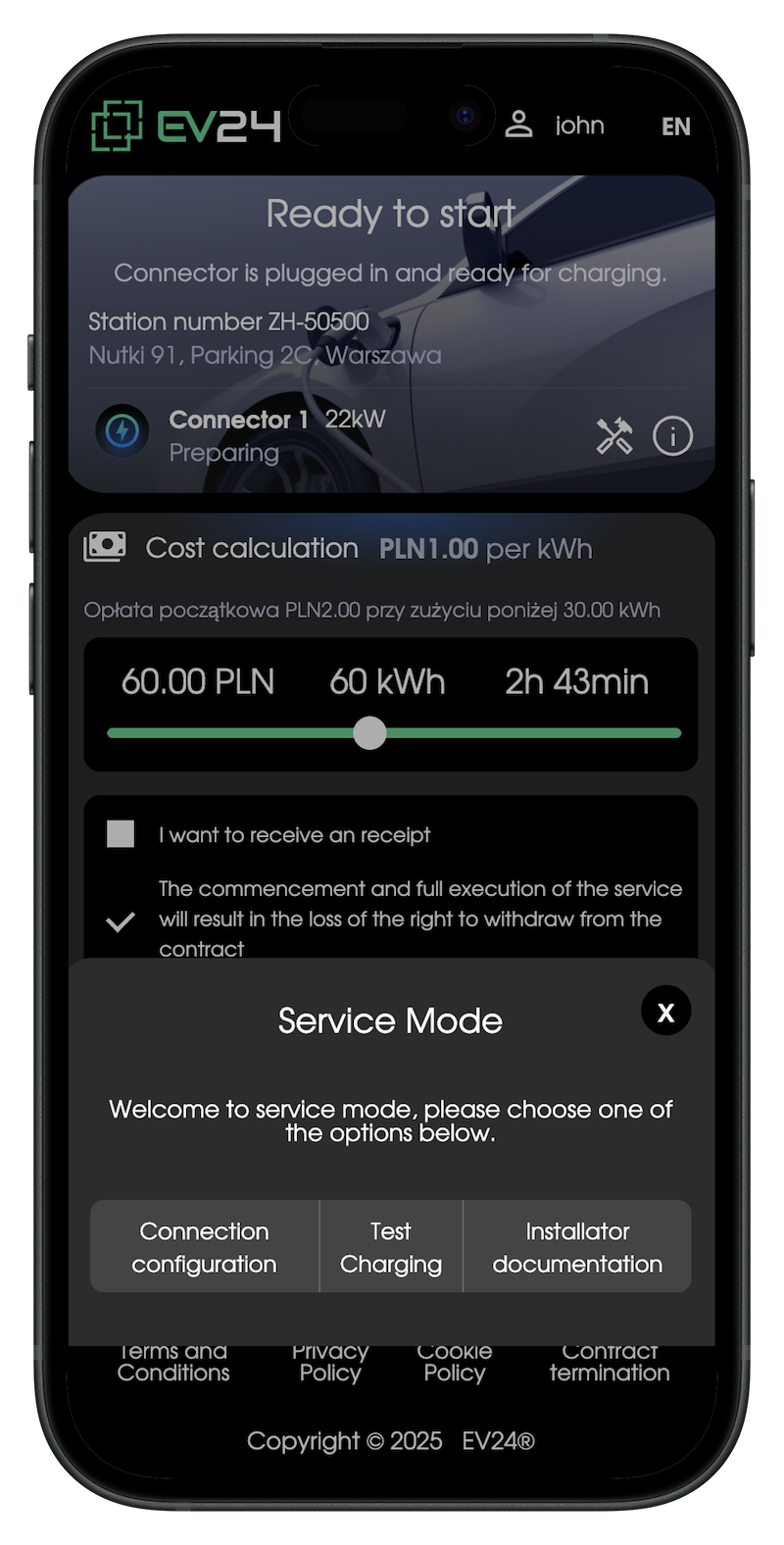 Führen Sie eine Test-Ladesitzung mit einem E-Fahrzeug durch: Starten und stoppen Sie das Laden über die EV24-App.