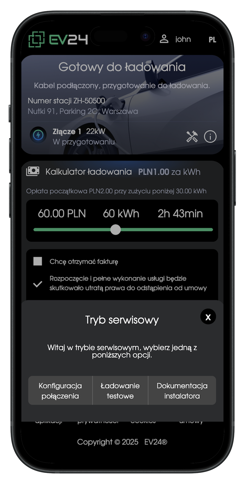 - Możesz dokonać testowej płatności za ładowanie lub posiadasz dostęp do PINu serwisowego