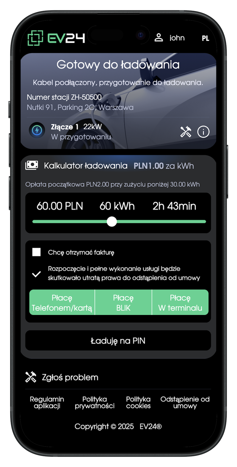 Przeprowadź testowe ładowanie pojazdu elektrycznego, rozpocznij oraz zakończ ładowanie z poziomu aplikacji EV24.